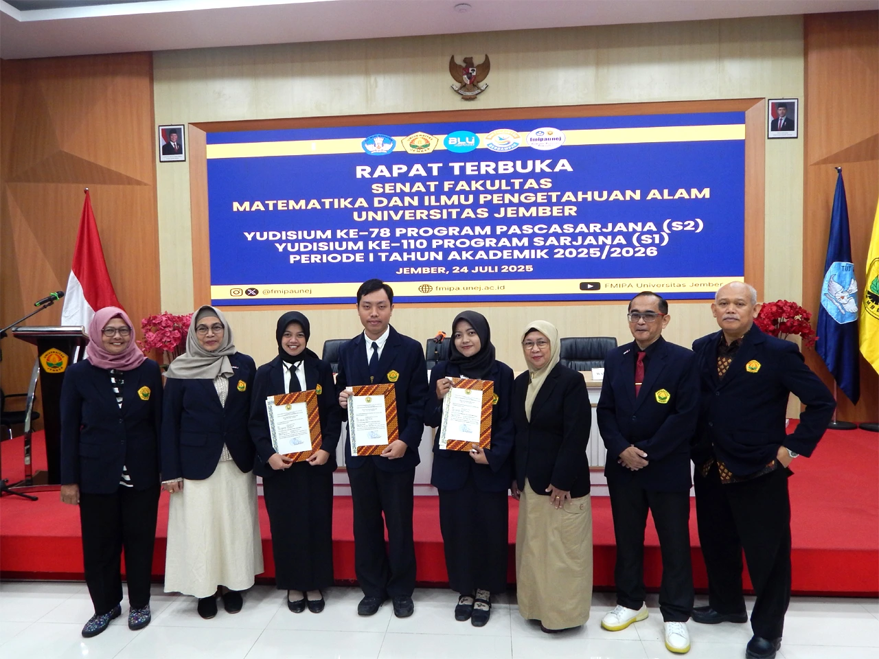Next, the reading of the decree of the Dean of FMIPA regarding the 78th Postgraduate (S2) and 110th Undergraduate Graduation of the Faculty of Mathematics and Natural Sciences, University of Jember, period I, Academic Year 2025/2026 by the Deputy Dean III of FMIPA Dr. Edy Supriyanto, S.Si., M.Si. Followed by congratulations by the Deputy Deans and Heads of Departments to all graduates. In this period’s graduation, Yusfi Afidah, S.Pd. from the Master of Biology Study Program achieved the highest GPA graduate predicate, namely 4.00 with a study period of 1 year 9 months 18 days. Meanwhile, the highest GPA graduate of the Undergraduate Program was achieved by Gilbert Geraldo Guanawan from the Biology Bachelor’s Study Program with a GPA of 3.97 with a study period of 3 years 4 months 23 days. The fastest graduate was Dian Firtana Putri from the Biology Bachelor’s Program with a GPA of 3.69 and a study period of 3 years, 4 months, 21 days.