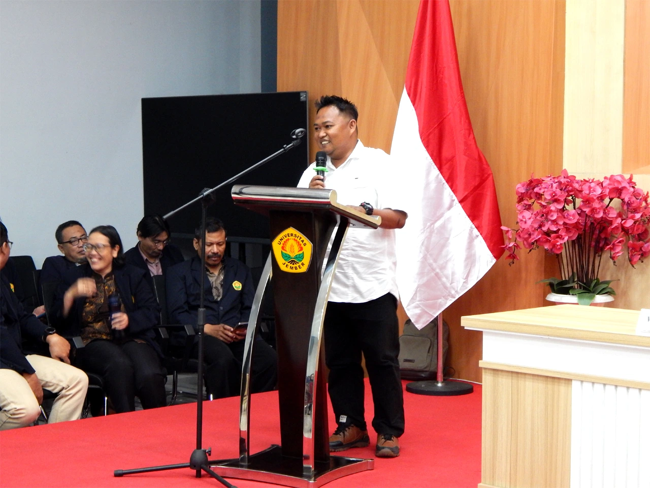 The motivational speech at the graduation ceremony was delivered by Kurniawan Nurhudha, S.Si, a Chemistry Department alumnus from the class of 2006. The owner of the Best One Indonesia business revealed the secret for FMIPA graduates to be competitive in the world of work. “We FMIPA alumni must have a high fighting spirit, have new ideas wherever we are,” he said. He gave an example of himself who has explored all roles in various fields of work. “During my thesis, I was working at the Jember Lung Hospital, then I went through various work worlds, with a high fighting spirit, everything can be done while continuing to learn and process to be better,” he continued.