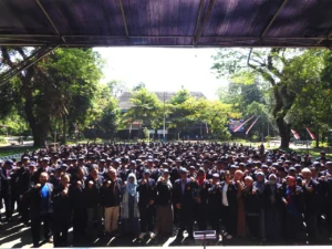 The Dean of the Faculty of Mathematics and Natural Sciences (FMIPA) at the University of Jember, Prof. Drs. Dafik, M.Sc., Ph.D., invited the new students of 2025 to shout the slogan at the beginning of their inauguration speech. (9/8) “Faculty of Mathematics and Natural Sciences, University of Jember, Creating, Innovating, Achieving!!!,” said the Dean, followed by all participants in the ceremony. He said the slogan also served as a prayer that all new students would ultimately become a generation imbued with creativity, innovation, and achieve. “You all come as FMIPA students from various places, with varying levels of ability. There’s no need to feel inferior. With this slogan, let’s enthusiastically move forward together to make it happen,” he continued. The Dean also encouraged the new students to start implementing the slogan to become FMIPA graduates who achieve 3.5 to the power of 4.