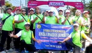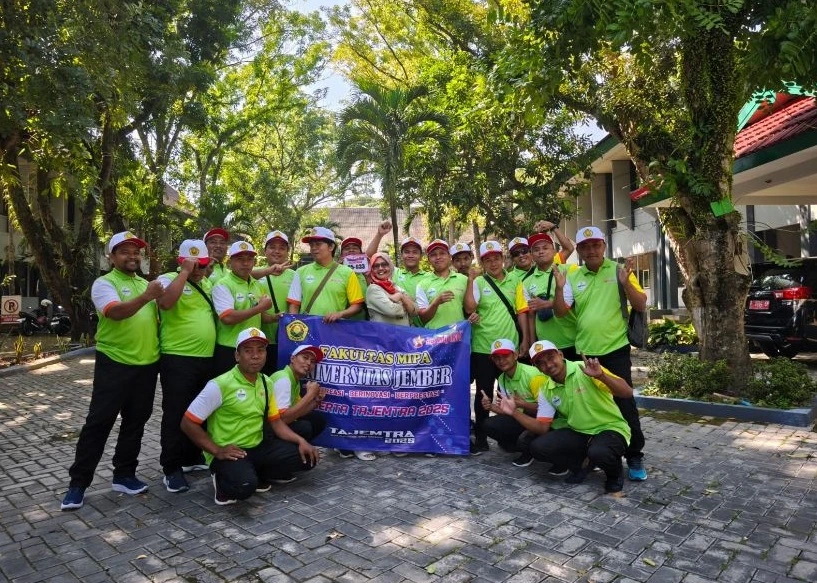 TAJEMTRA 2025 kembali digelar, sebuah acara tradisional tahunan yang diselenggarakan oleh Pemerintah Kabupaten Jember, dan menjadi agenda rutin tim FMIPA UNEJ mengikuti TAJEMTRA. Beranggotakan tenaga kependidikan FMIPA, tim ikut ambil bagian dalam kegiatan jalan sejauh 30 kilometer dari Tanggul ke Jember (23/8). Tahun ini, kembali membentangkan spanduk jargon FMIPA UNEJ Berkreasi, Berinovasi dan Berprestasi, ingin gaungkan jargon FMIPA UNEJ ke masyarakat luar. “Selain berolah raga, tim FMIPA UNEJ miliki visi untuk gaungkan FMIPA UNEJ ke masyarakat Jember, gudangnya calon scientist muda,” ungkap Verry, koordinator tim FMIPA UNEJ. Dukungan juga datang dari pimpinan FMIPA UNEJ, Dekan dan para Wakil Dekan FMIPA. Selain dana, dukungan moril dengan turut melepas keberangkatan tim FMIPA UNEJ.